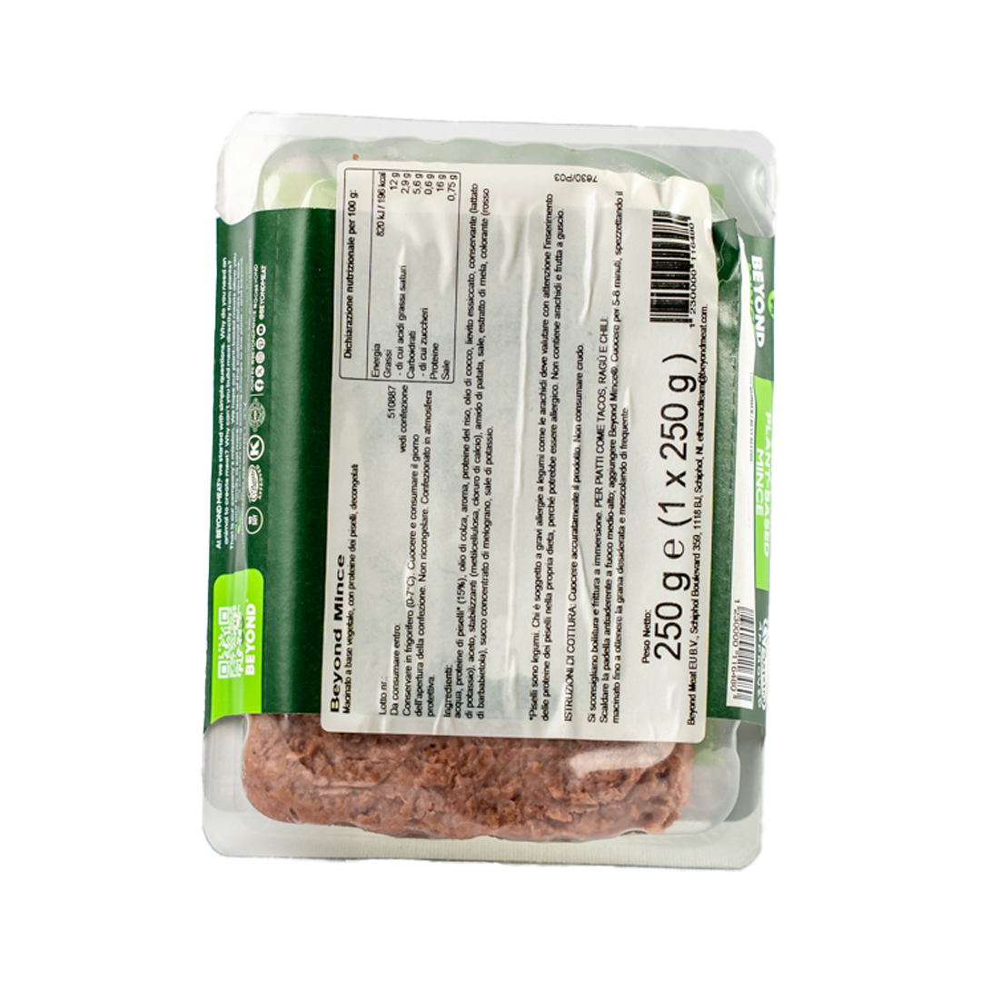 Acqua, proteine di piselli* (15%), olio di colza, aroma, proteine di riso, olio di cocco, lievito essiccato, conservante (lattato di potassio), aceto, stabilizzanti (metilcellulosa, cloruro di calcio), amido di patate, sale, estratto di mela, colorante (rosso barbabietola), succo di melograno concentrato, sale di potassio.