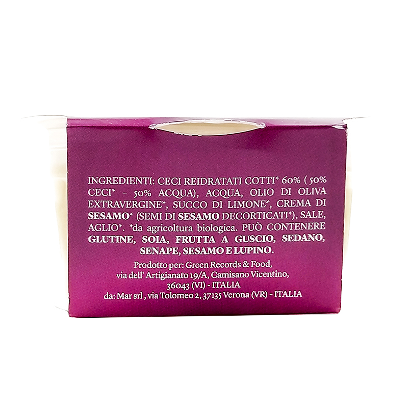 Ceci reidratati cotti* 60% (50% ceci* - 50% acqua), olio d'oliva extravergine*, succo di limone*, crema di sesamo* (semi di sesamo decorticati), sale, aglio*.