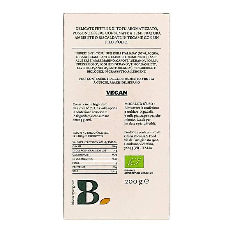 Tofu* (98%) (acqua, soia italiana*, nigari (coagulante: cloruro di magnesio), sale alle erbe* (sale marino, carote*, sedano*, porri*, prezzemolo*, timo*, basilico*, borragine*, aneto*, santoreggia*)