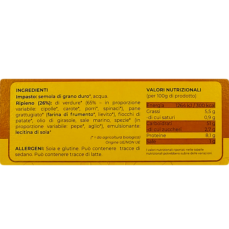 Ripieno (26%): di verdure * (65% – in proporzione variabile: cipolle *, carote *, porri *, spinaci *), pane grattugiato * ( farina di frumento *, lievito *), fiocchi di patate *, olio di girasole, sale marino, spezie * (in proporzione variabile: pepe*, aglio*), emulsionante: lecitina di soia *