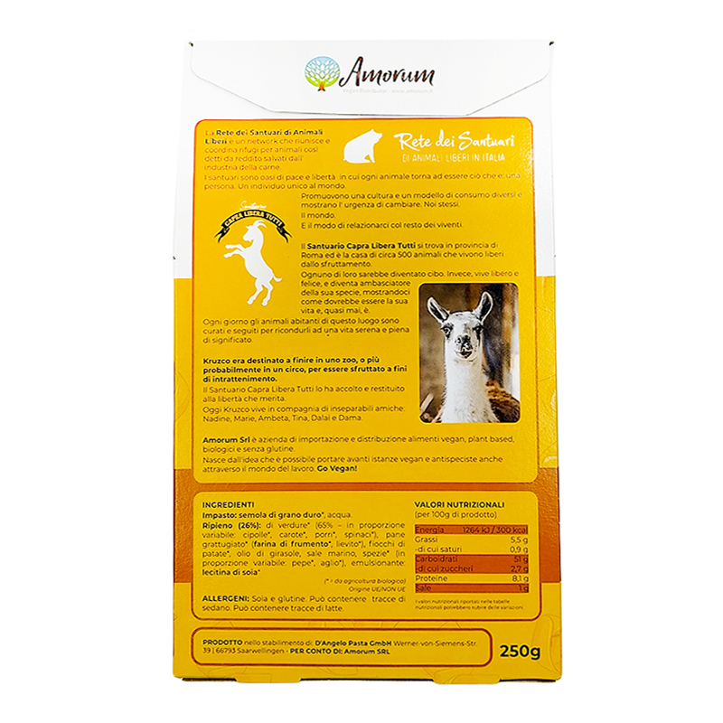 Ripieno (26%): di verdure * (65% – in proporzione variabile: cipolle *, carote *, porri *, spinaci *), pane grattugiato * ( farina di frumento *, lievito *), fiocchi di patate *, olio di girasole, sale marino, spezie * (in proporzione variabile: pepe*, aglio*), emulsionante: lecitina di soia *