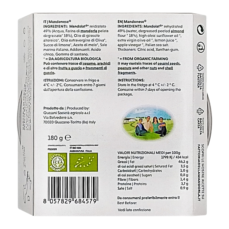 La mandonese - Mayo è una salsa spalmabile a base di mandorla, ottima per accompagnare ogni preparazione e per farcire i tuoi panini.