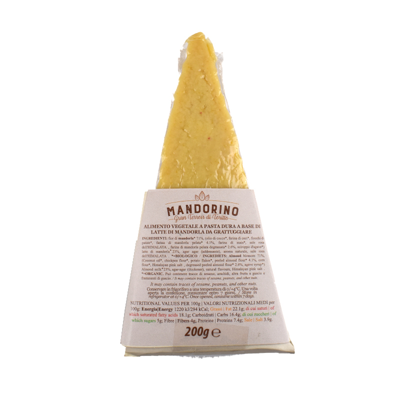 Fior di Mandorla* 72%, (olio di cocco*, farina di ceci*, fiocchi di patate*, farina di mandorla pelata* 4%, farina di mais*, farina di mandorla pelata degrassata* 2.6%, Sale marino italiano, sciroppo d'agave*), Emulsione di mandorla* 23% (acqua, olio di cocco*, farina di mandorla pelata degrassata* 12.1%), agar-agar (addensante), Aroma naturale di estratto di lievito biologico, Sale marino italiano.