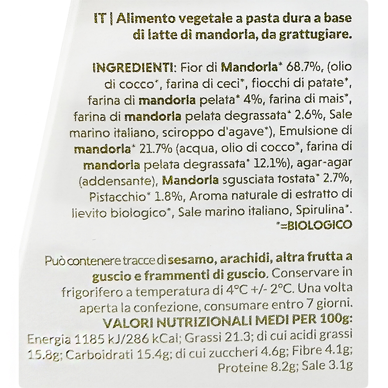 d'agave*), Emulsione di mandorla* 21.7% (acqua, olio di cocco*, farina di mandorla pelata degrassata* 12.1%), Mandorla sgusciata tostata* 2.7%, Agar-agar (addensante), Pistacchio* 1.8%, Aroma naturale di estratto di lievito biologico, Sale marino italiano, Spirulina*.1%), agar-agar (addensante), Aroma naturale di estratto di lievito biologico, Sale marino italiano.