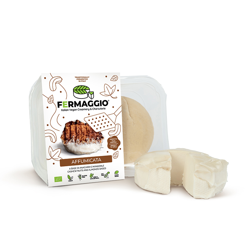 L'affumicata di Fermaggio è un'alternativa vegetale a base di anacardi e mandorle. L'affumicatura con legno di faggio le conferisce un sapore deciso.