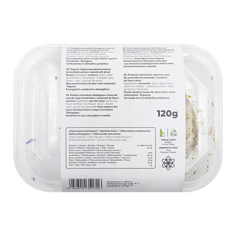 La forma con fiori eduli Bio è un'alternativa vegetale a base di anacardi e ricoperta con fiori edibili. I fiori essiccati utilizzati sono malva, calendula, fiordaliso e rosa e conferiscono colori e sapori unici.