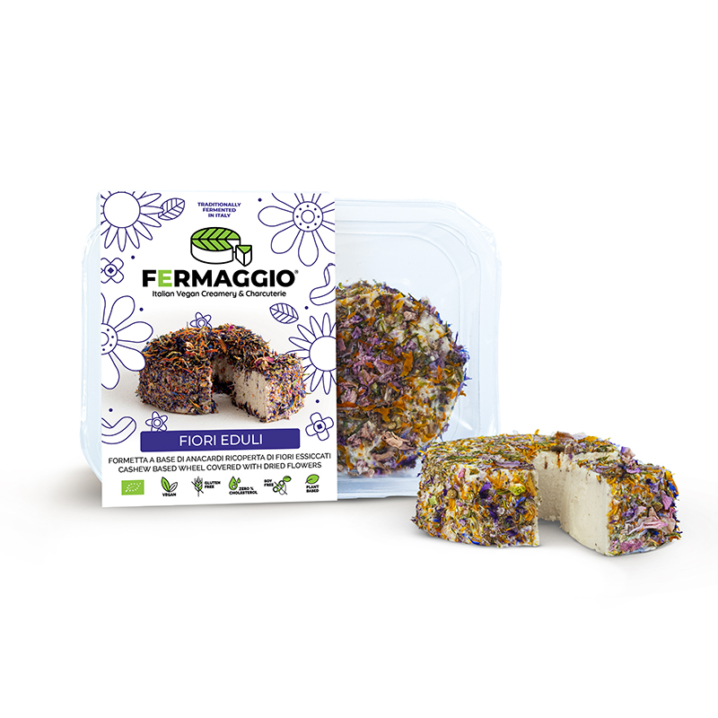La forma con fiori eduli Bio è un'alternativa vegetale a base di anacardi e ricoperta con fiori edibili. I fiori essiccati utilizzati sono malva, calendula, fiordaliso e rosa e conferiscono colori e sapori unici.