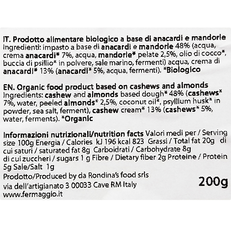 Impasto a base di anacardi e mandorle 48% (acqua, anacardi* 7%,mandorle* pelate 2,5%, olio di cocco*, buccia di psillio* in polvere (Può contenere tracce di sesamo e senape), sale marino, fermenti) acqua, crema di anacardi* 13% (anacardi* 5%, acqua, fermenti). *da agricoltura biologica