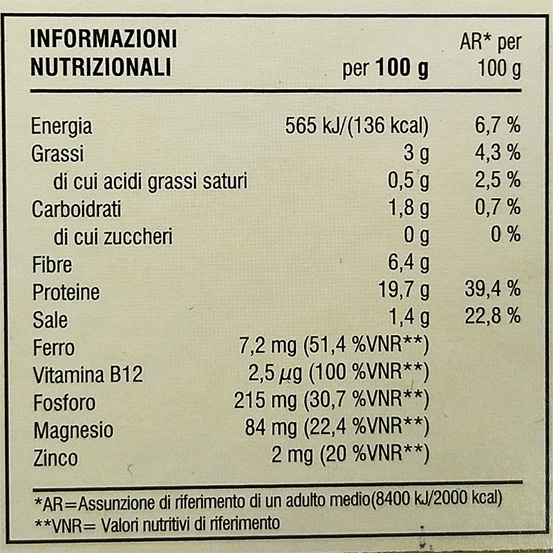Acqua, concentrate di proteine di soia (25%), olio di colza, olio extra vergine di oliva, sale, aromi, spezie e vitamina B12.
