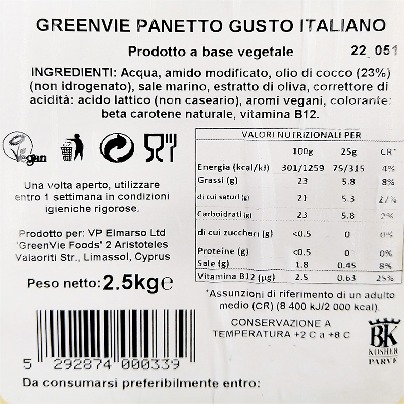 Acqua, olio di cocco non idrogenato (23%), amido modificato, sale marino, estratto di oliva, correttore di acidità (acido lattico) aromi vegani, colore (beta carotene naturale), vitamina B12.