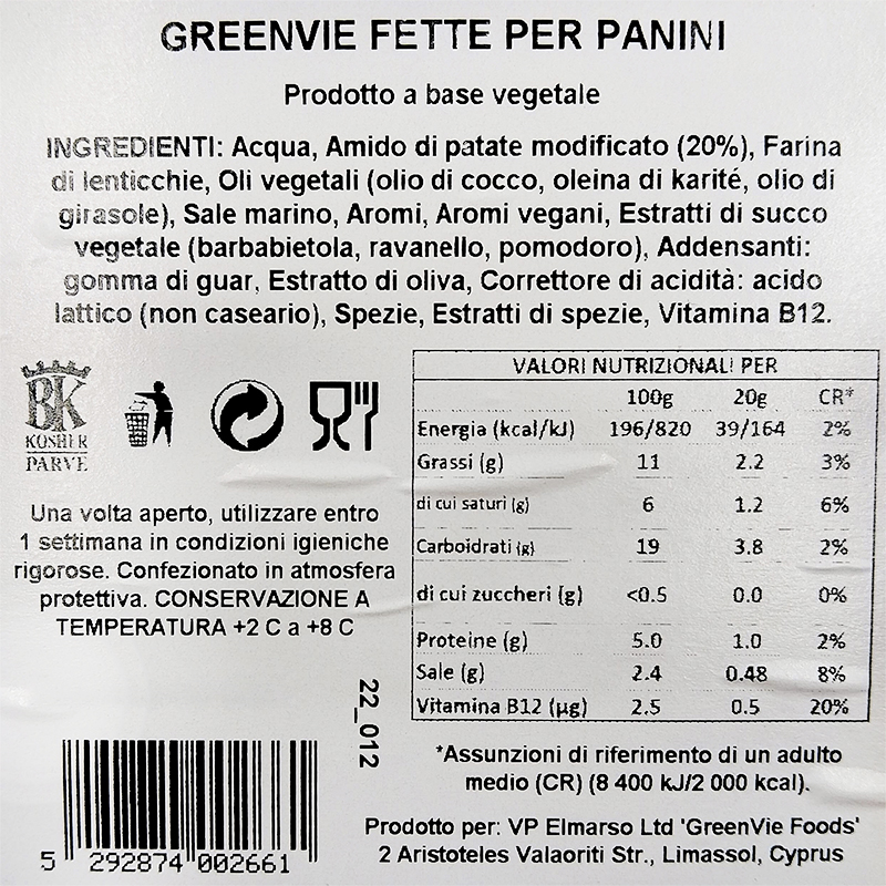 Acqua, amido di patate modificato (20%), farina di lenticchie, oli vegetali (cocco, oleina di karité, girasole), sale marino, aromi, aromi naturali, estratti di succo vegetale (barbabietola rossa, ravanello, pomodoro), gomma di guar, estratto di oliva, correttore di acidità: acido lattico, spezie, estratti di spezie, vitamina B12.
