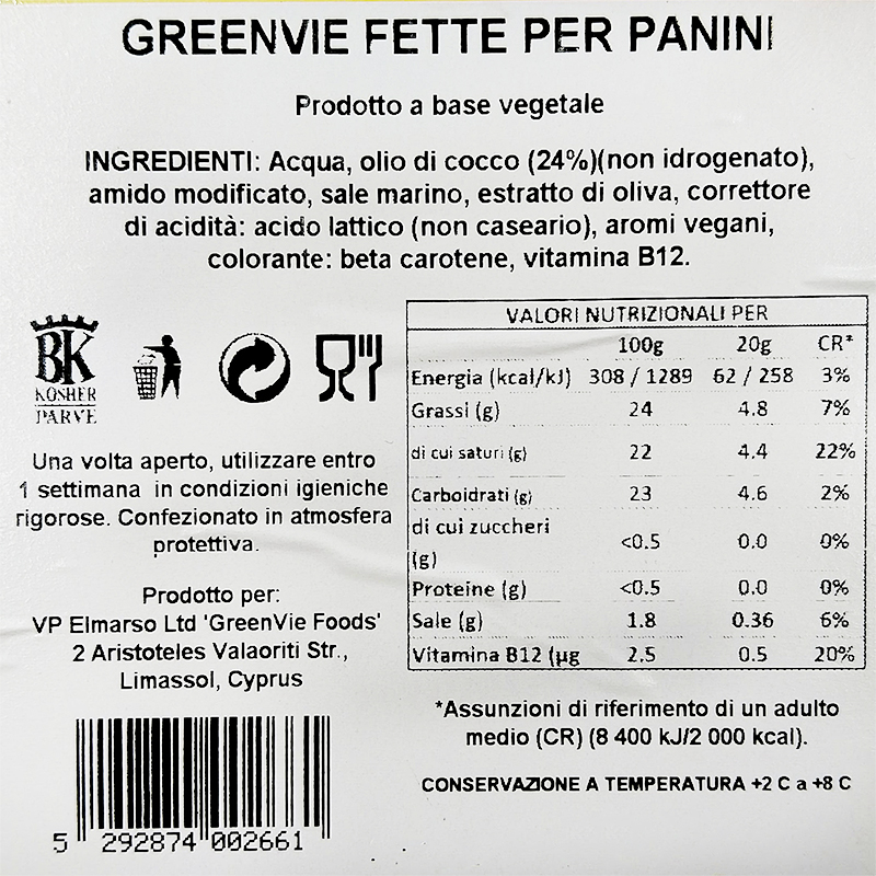 Acqua, Olio di Cocco (24%), Amido Modificato, Sale, olio di Oliva, Correttore di Acidità: Acido Lattico, Aromi Vegani, Colorante: Beta Carotene, Vitamina B12.