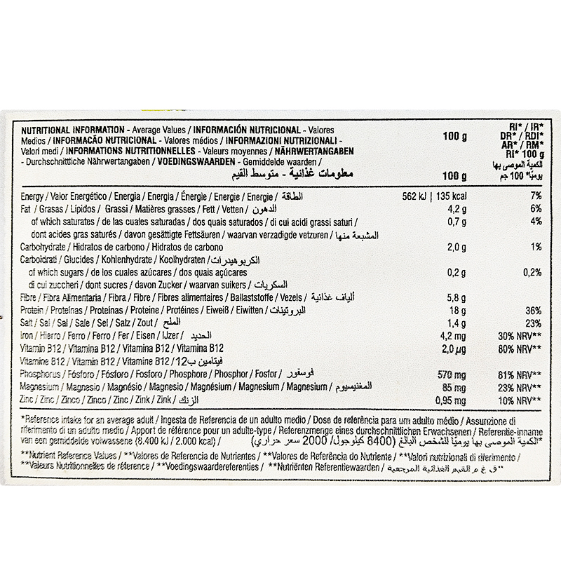 Acqua, proteine di soia concentrate* 27,2%, olio di oliva 5,9%, sale, aromi, destrosio, spezie e vitamina B12.