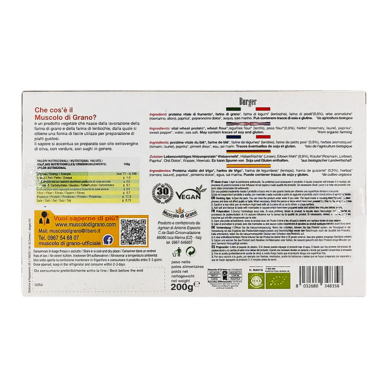 Il Burger Bio Muscolo di Grano è ricco di proteine, grazie alla presenza della farina di grano e della farina di lenticchie. Infatti il Muscolo di Grano nasce dalla lavorazione di queste due farine, dalla quale si ottenugono prodotti di facile utilizzo per la preparazione di piatti deliziosi.
