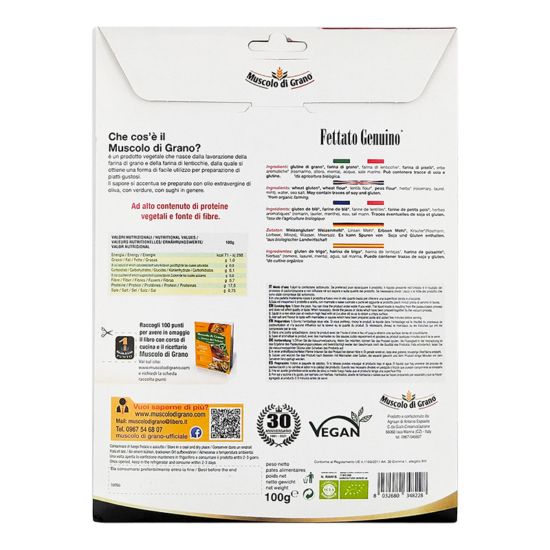 Il Fettato Genuino Bio di Muscolo di Grano, è ricco di proteine e fonte di fibre. Ottenuto dalla lavorazione della farina di grano e della farina di lenticchie, può essere utilizzato per arricchire ogni preparazione.
