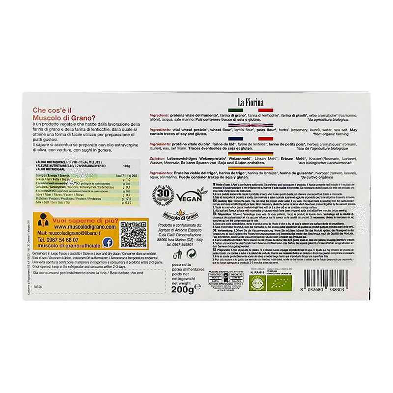 Proteina vitale di frumento*, farina di grano*, farina di legumi*(lenticchie), farina di piselli*, erbe aromatiche*(rosmarino, alloro), acqua, sale marino.