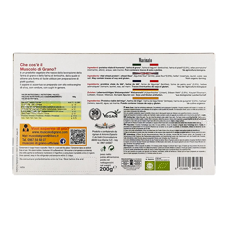 Il Macinato bio di Muscolo di Grano è perfetto per preparare polpette, polpettoni, ripieni e ragù 100% vegetali. La particolarità è la presenza di proteina vitale di frumento e legumi, che rendono il Macinato l'ingrediente perfetto per garantire il giusto apporto proteico alla tua alimentazione.