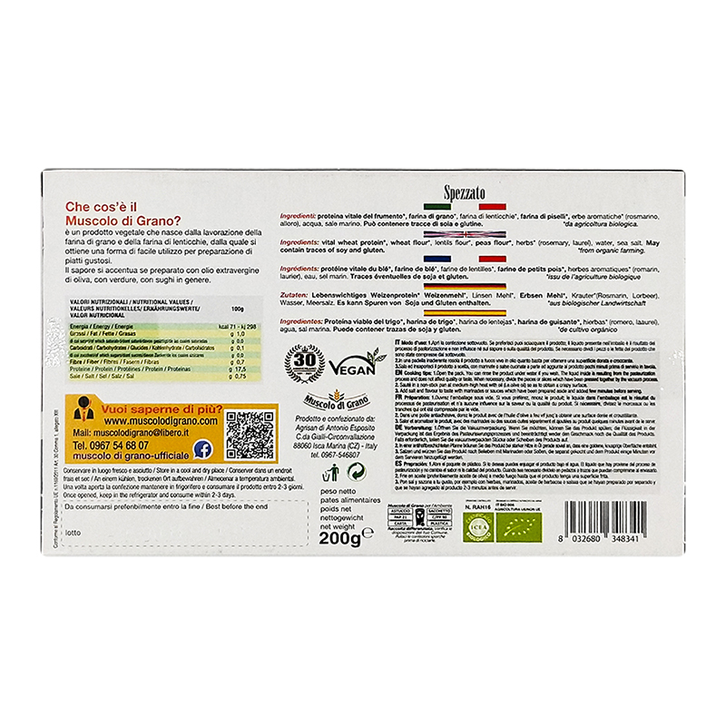 Proteina vitale di frumento*, farina di grano*, farina di legumi*(lenticchie), farina di piselli*, erbe aromatiche*(rosmarino, alloro), acqua, sale marino.