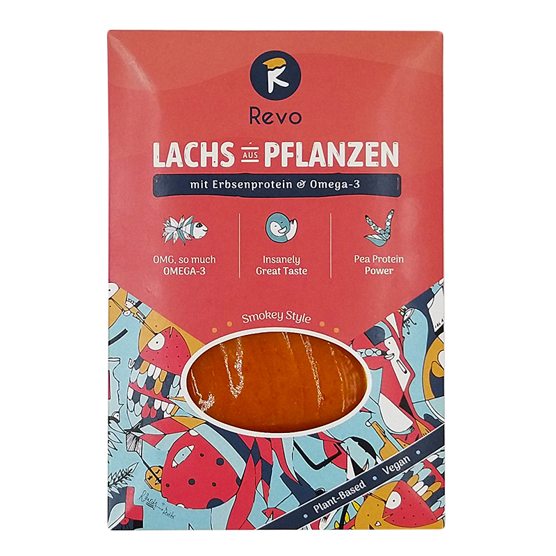 Acqua, proteine di piselli 6%, oli vegetali (olio di colza, olio di lino), gelificante: alginato di calcio, addensante: carragenina, konjac, aromi, sale marino, amido modificato, aromi naturali, concentrato di barbabietola, vitamine (vitamina B2, vitamina 6, vitamina b12, vitamina D2), pigmento: carotene.