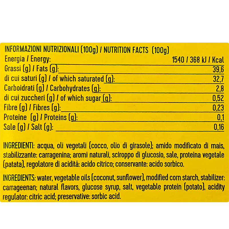 Acqua, oli vegetali (cocco, olio di girasole); amido modificato di mais, stabilizzante: carragenina; aromi naturali, sciroppo di glucosio, sale, proteina vegetale (patata), regolatore di acidita?: acido citrico; conservante: acido sorbico
