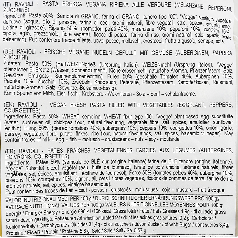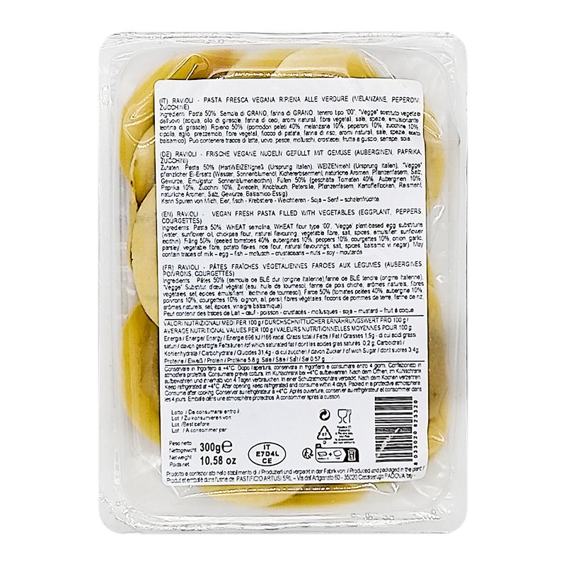 Pasta 50% (farina di GRANO tenero tipo “00”, semola di GRANO, Vegge® sostituto vegetale dell’uovo (acqua, olio di girasole, farina di ceci, aromi naturali, fibre vegetali, sale, spezie). Ripieno 50% (pomodori pelati 40%, melanzane 10%, peperoni 10%, zucchine 10%, cipolla, aglio, prezzemolo, fibre vegetali, fiocco di patate, farina di riso, aromi naturali, sale, spezie, aceto balsamico).