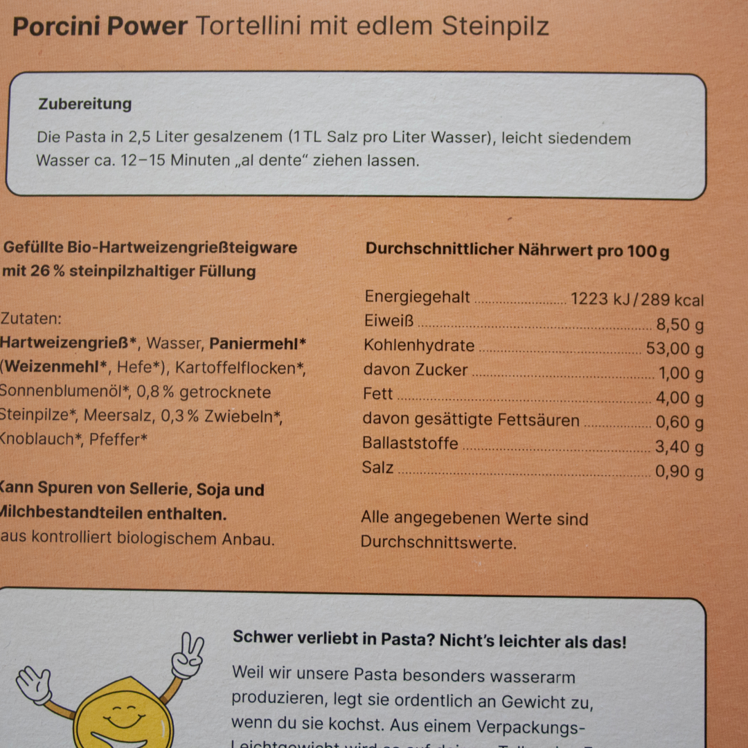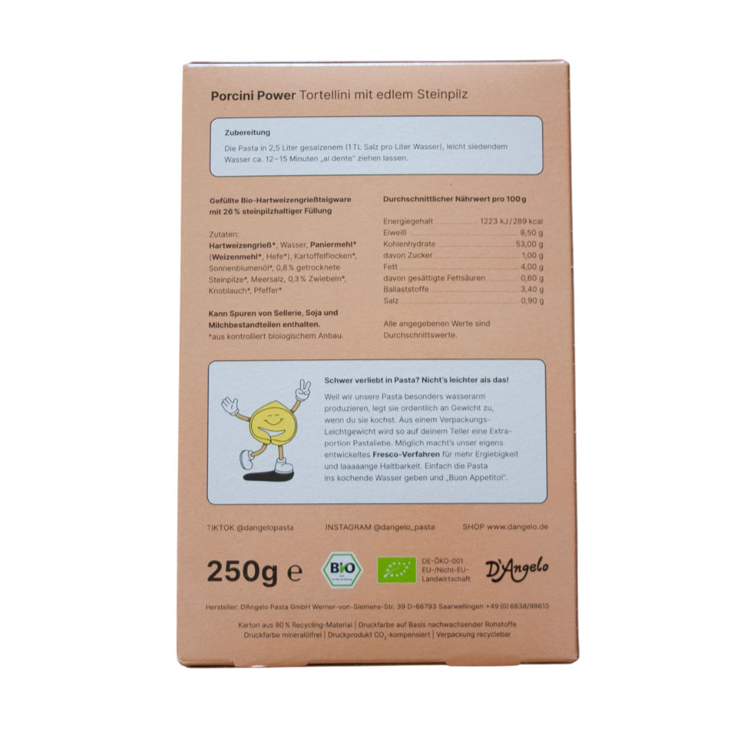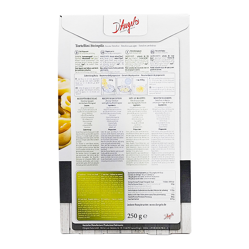 Ripieno (26%): pangrattato * ( farina di frumento *, lievito *), Funghi porcini * (30%), fiocchi di patate *, cipolla *, olio di girasole, sale marino, emulsionante lecitina di soia * , aglio * , pepe *.