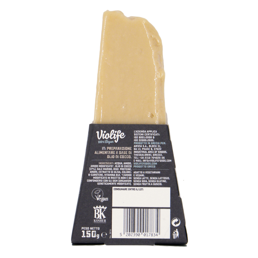 Acqua, olio di cocco 17%, amido modificato, amido, sale marino, proteine del riso, aroma vegano, estratto di olive, acidificante: acido citrico, colorante: B-carotene.