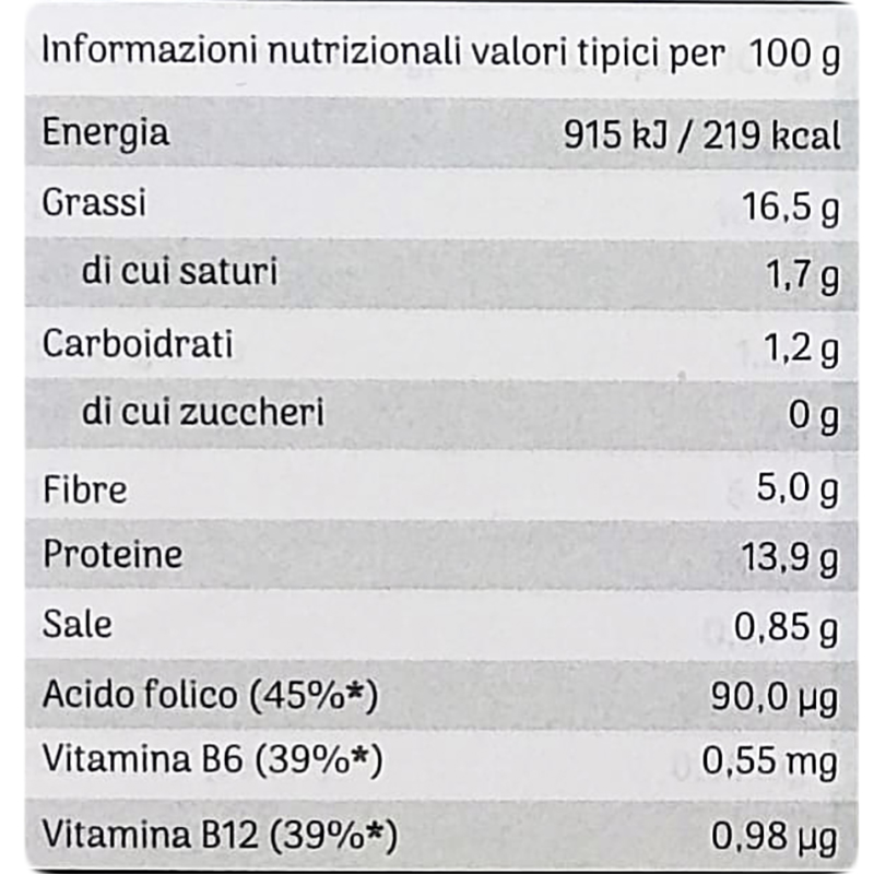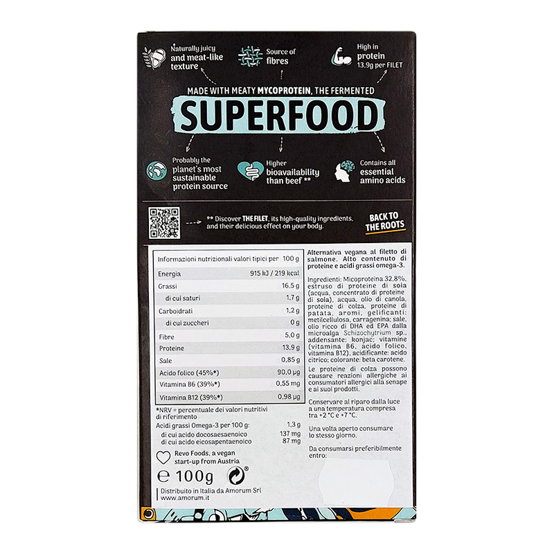 Le micoproteine di cui è fatto, garantiscono il perfetto apporto proteico ed un profilo di aminoacidi completo. Ottima fonte di vitamina B2, B3, B6, B12 e D2, grazie alla presenza di olio algale è ricco anche di Omega-3.