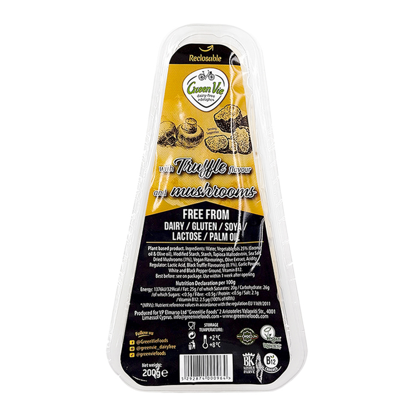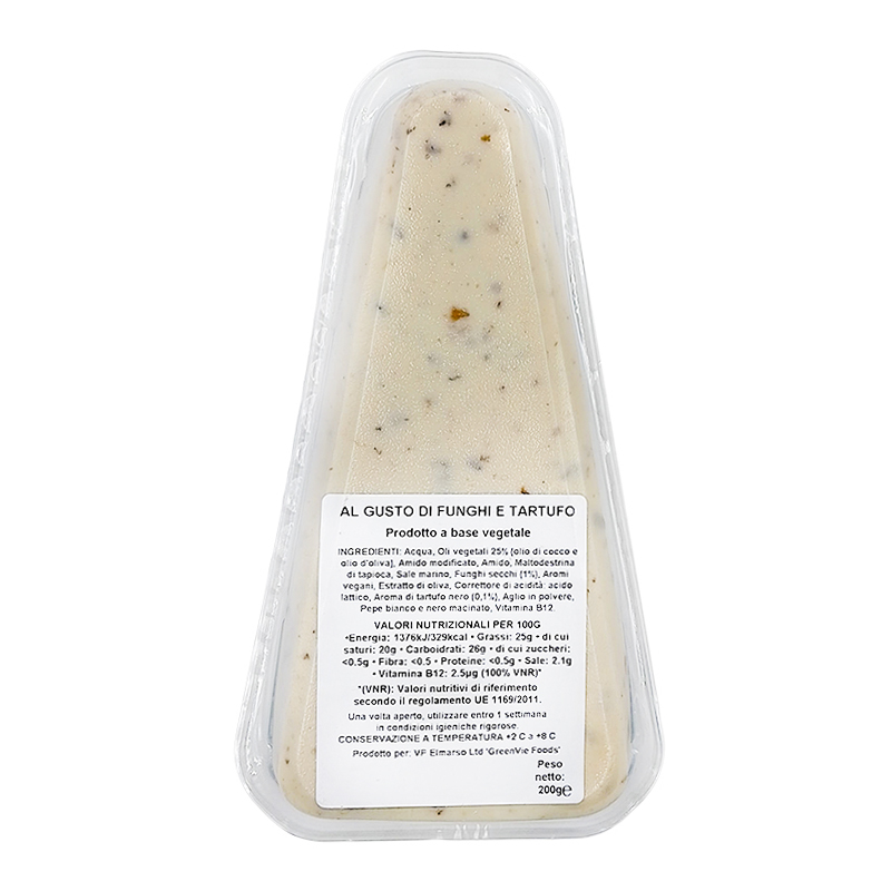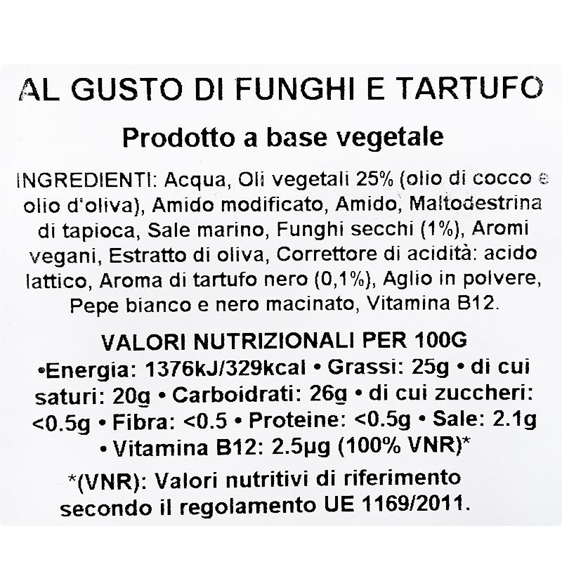 Acqua, Oli vegetali 25% (olio di cocco e olio d’oliva), Amido modificato, Amido, Maltodestrina di tapioca, Sale marino, Funghi secchi (1%), Aromi vegani, Estratto di oliva, Correttore di acidità: acido lattico, Aroma di tartufo nero (0,1%), Aglio in polvere, Pepe bianco e nero macinato, Vitamina B12.