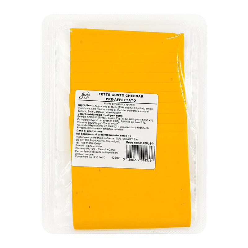 Le fette gusto cheddar, sono completamente vegetali e sono perfetti per farcire toat, padine, panini o da mettere sulla pizza.