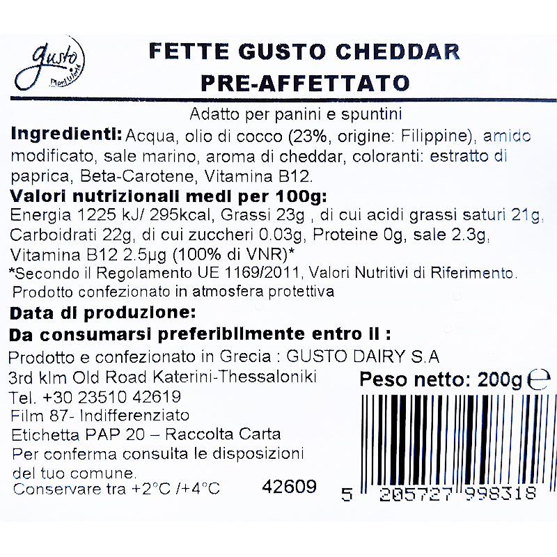 Acqua, Olio di cocco (23%), Amido modificato, Sale marino, Aroma cheddar, Colorante: Estratto di paprika, Beta-carotene, Vitamina B12.