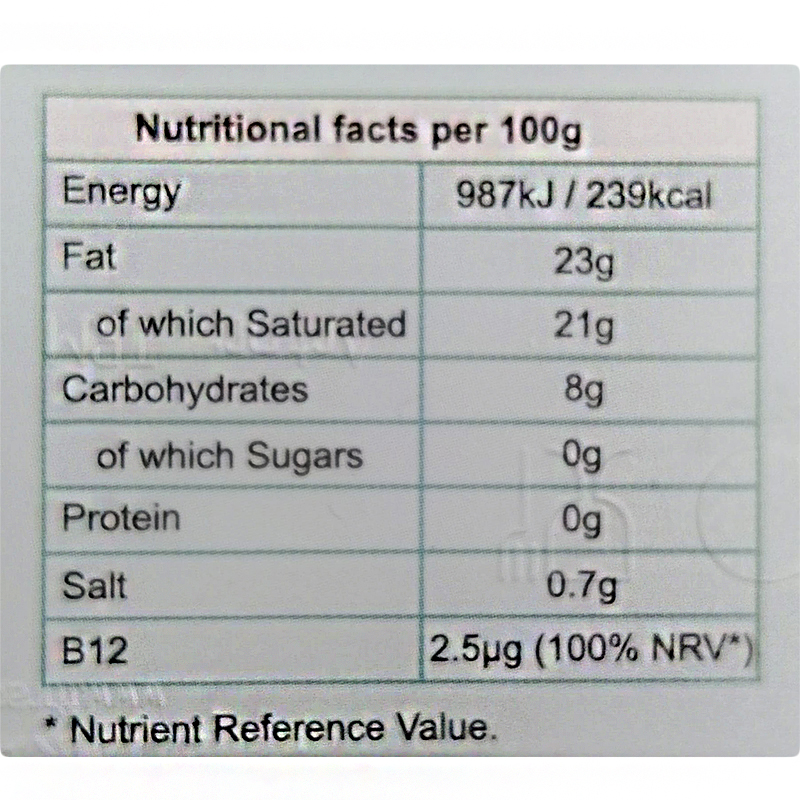 Acqua, olio di cocco (24%), amido di patate, proteine vegetali di patate, sale marino, aromi e vitamina B12.