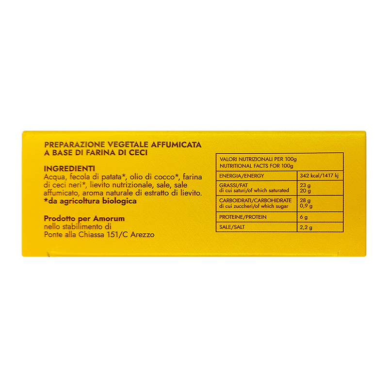 L’Amorino affumicato è un’alternativa vegetale a base di farina di ceci. Nata in collaborazione con la Rete dei Santuari, grazie all’Amorino porterai in tavola non solo l’eccellenza di un formaggio vegetale prodotto in Italia, ma anche la storia di un rifugio e di un animale che è stato salvato e che ora vive libero e felice.