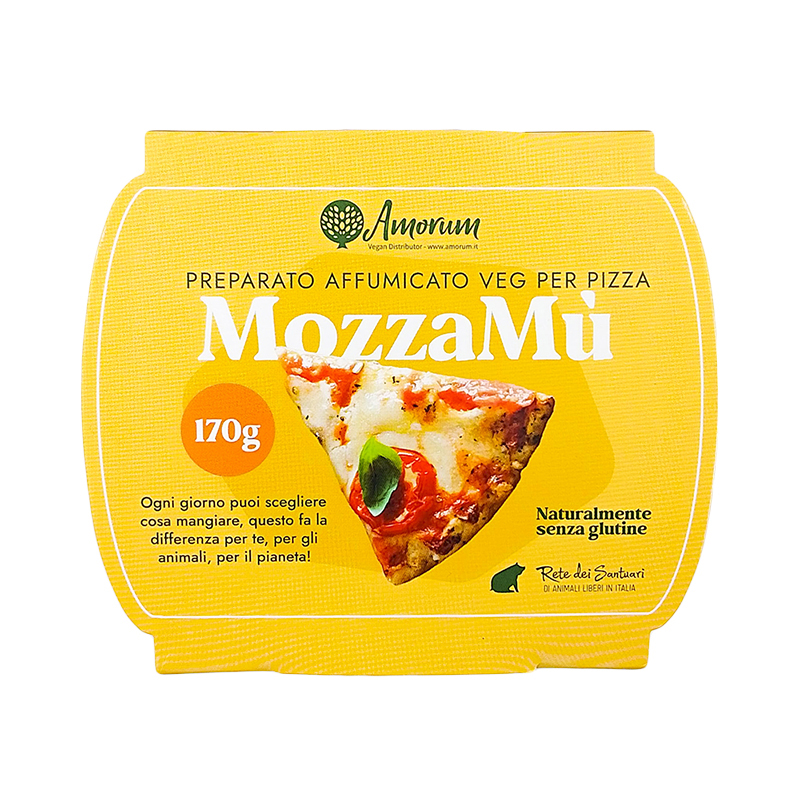 La MozzaMù è l’alternativa vegetale alla mozzarella, dal gusto affumicato, per chi ama i sapori decisi. È nata dalla collaborazione tra Amorum e la Rete dei Santuari di Animali Liberi.
