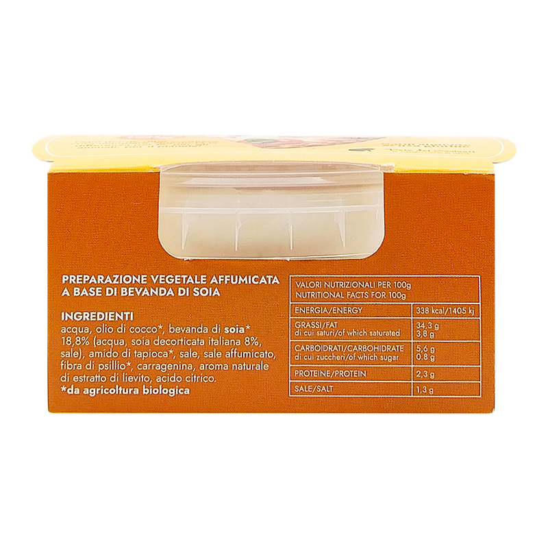 Acqua, olio di cocco*, bevanda di soia* 18,8% (acqua, soia decorticata italiana 8%, sale), amido di tapioca*, sale, sale affumicato, fibra di psillio*, carragerina, arama naturale di estratto di lievita, acido citrico.