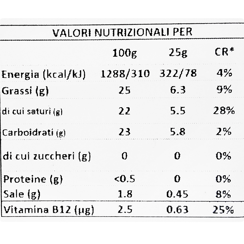 Acqua, olio di cocco non idrogenato (24%), amido modificato, sale marino, estratto di oliva, correttore di acidità (acido lattico) aromi vegani, colore: beta carotene naturale, vitamina B12.