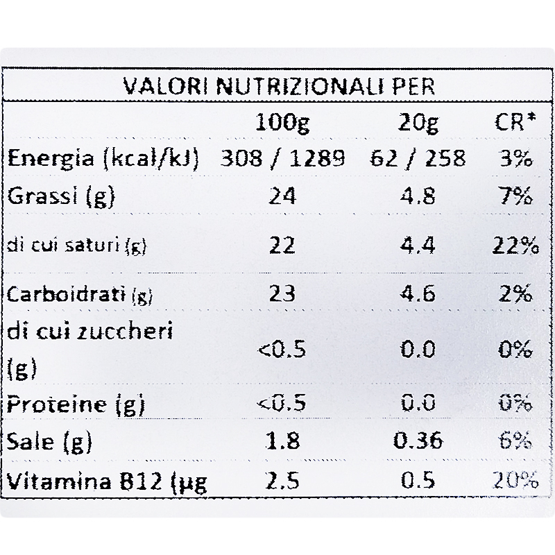 Acqua, Olio di Cocco non idrogenato (24%), amido modificato, sale marino, estratto di oliva, correttore di acidità: acido lattico non caseario, aromi vegani, colore: estratto di paprika, vitamina B12.