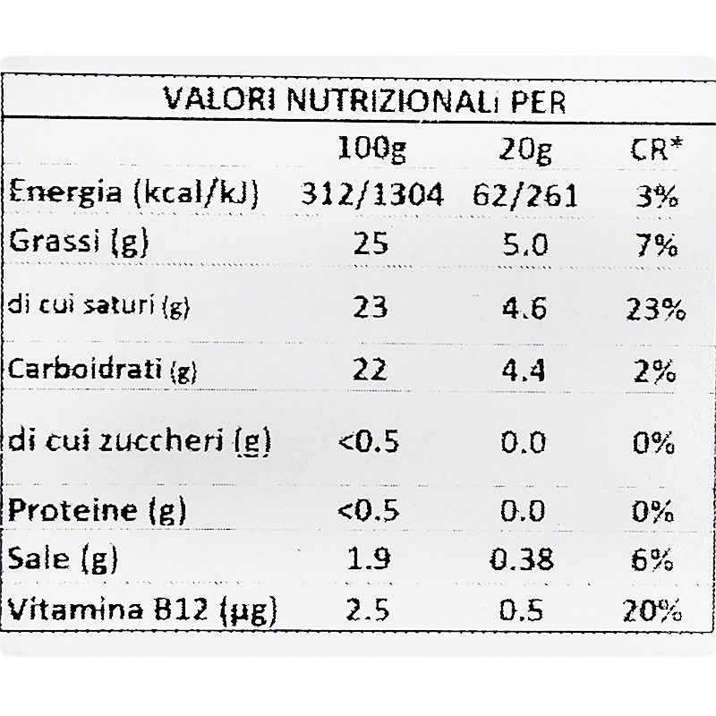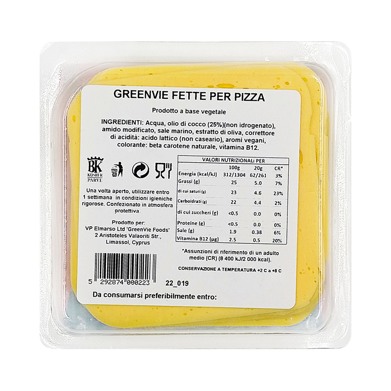Acqua, Olio di Cocco (23%), Amido Modificato, Sale, Estratto di Oliva, Correttore di Acidità: Acido Lattico, Aromi Vegani, Colorante: Beta Carotene Naturale, Vitamina B12