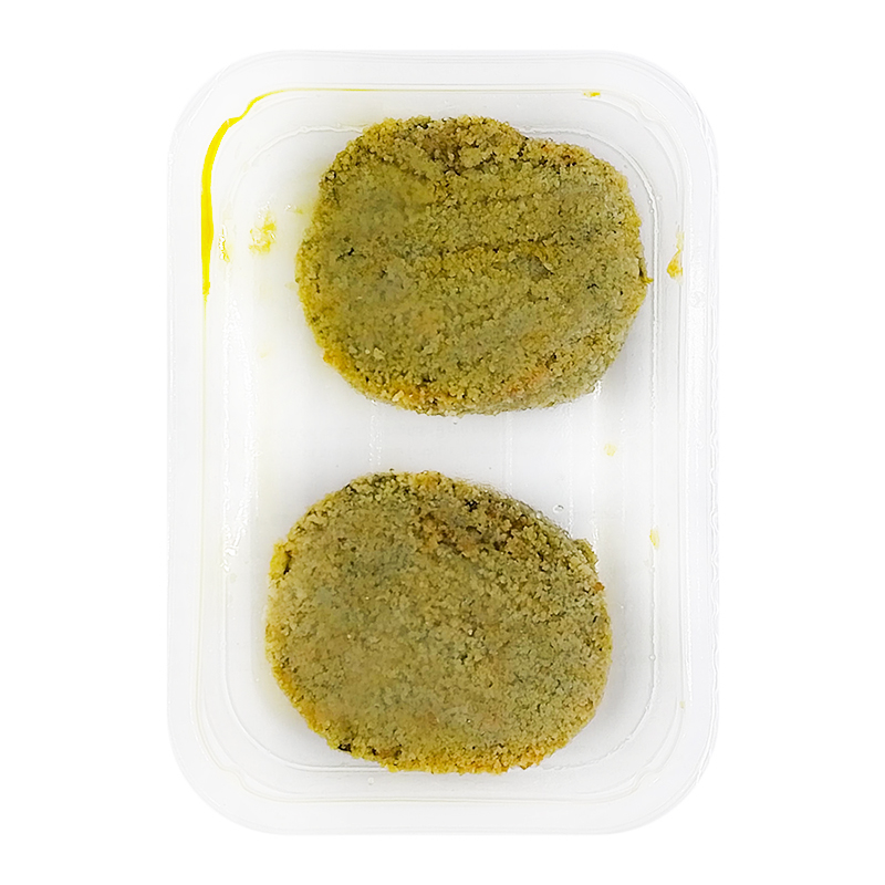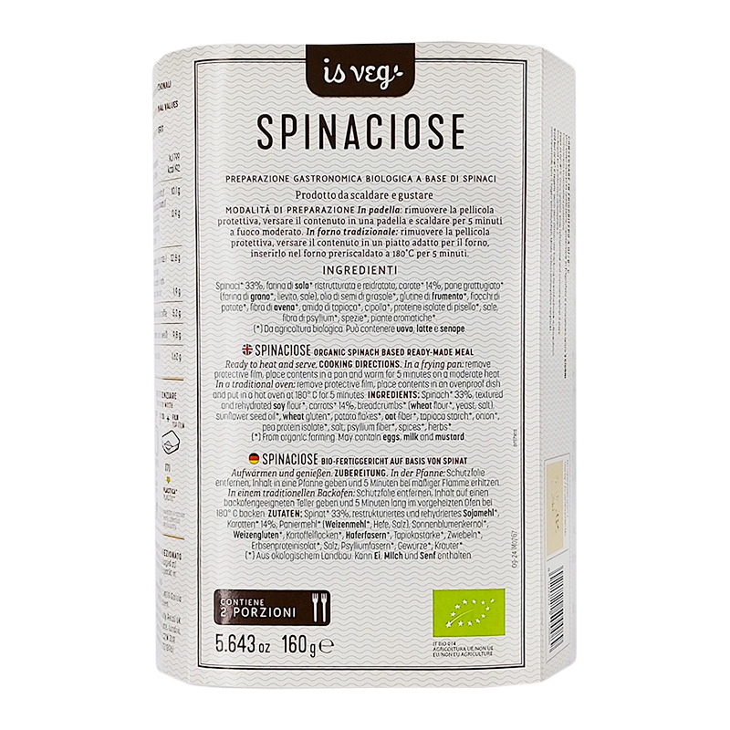 Spinaci* 33%, proteine di soia* ristrutturate e reidratate (acqua, proteine di soia* ristrutturate) carote* 14%, pane grattugiato* (farina di grano*, lievito, sale), olio di semi di girasole*, glutine di frumento*, fiocchi di patate*, fibra di avena*, amido di tapioca*, cipolla*, proteine isolate di pisello*, sale, fibra di psyllium*, pepe nero*, aglio*.