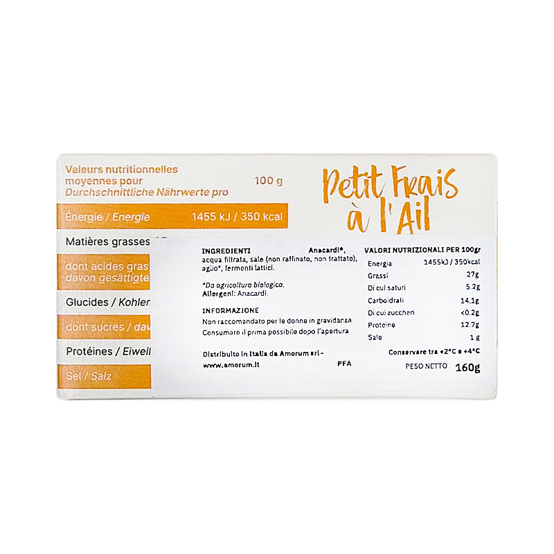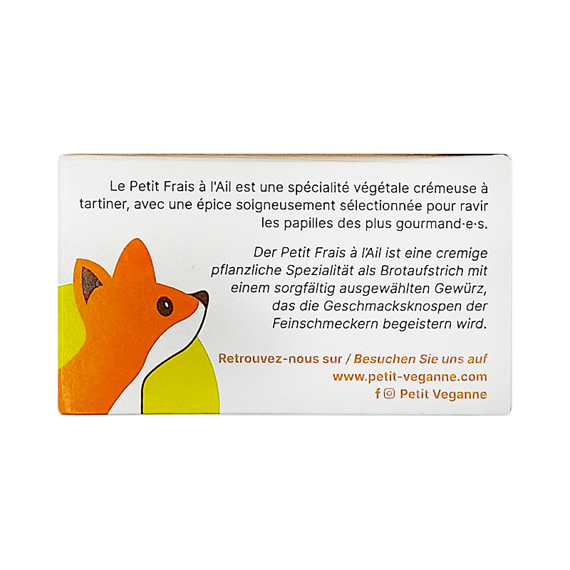 Il Petit Frai All’aglio è una specialità vegetale che può essere spalmata sul pane o semplicemente gustata così com’è. Le spezie attentamente selezionate delizieranno anche i palati più esigenti. Questa alternativa vegetale e biologica, viene fatta stagionare per diverse settimane, il che le conferisce una crosta sottile che ne preserva il cuore cremoso.