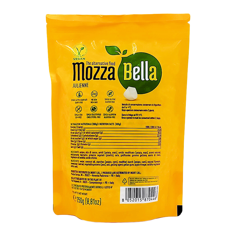 La MozzaBella è l'alternativa vegetale alla mozzarella, completamente vegetale e priva di colesterolo ed allergeni. Provala sulla pizza e per tutte le preparazioni da forno!