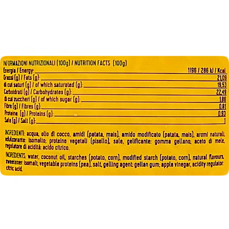Acqua, olio di cocco, amidi (patata, mais), amido modificato (patata, mais), aromi naturali, edulcorante: isomalto; proteine vegetali (pisello), sale, gelificante: gomma gellano; aceto di mele, regolatore di acidità: acido citrico.