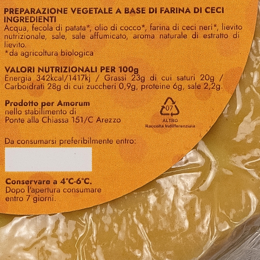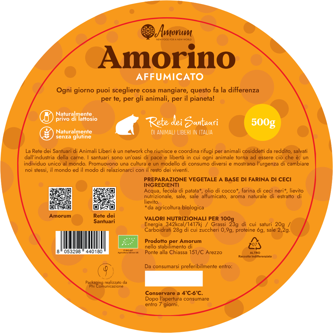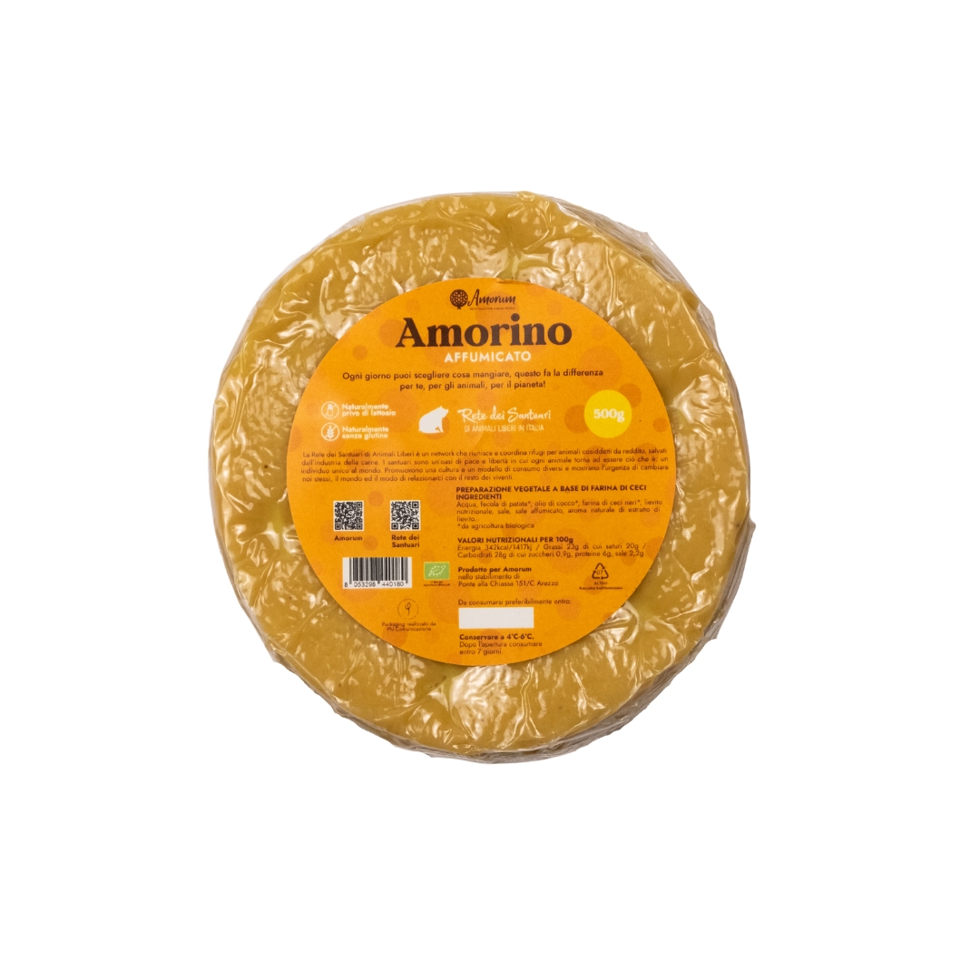 L’Amorino affumicato è un’alternativa vegetale a base di farina di ceci. Nata in collaborazione con la Rete dei Santuari, grazie all’Amorino porterai in tavola non solo l’eccellenza di un formaggio vegetale prodotto in Italia, ma anche la storia di un rifugio e di un animale che è stato salvato e che ora vive libero e felice.