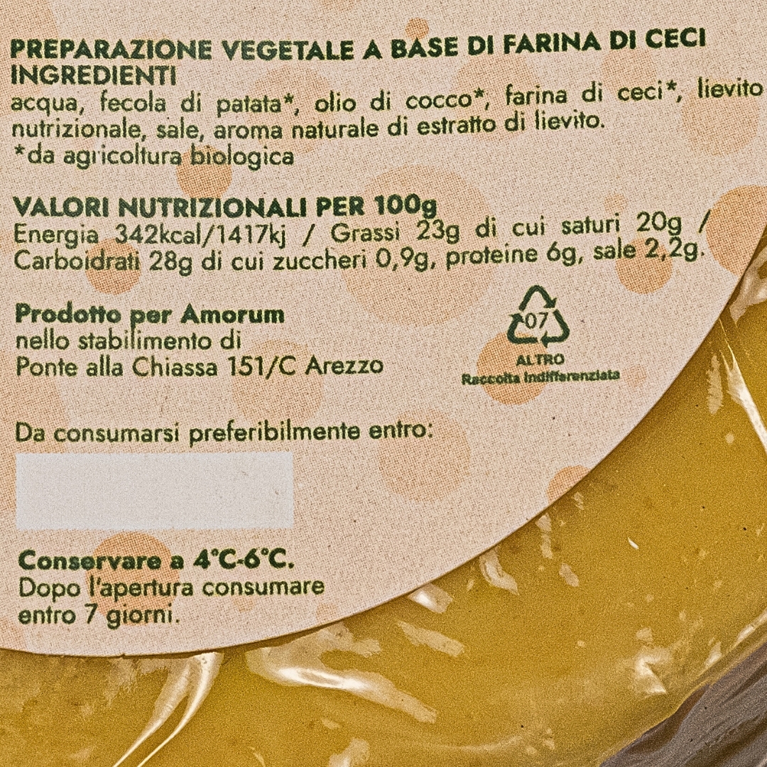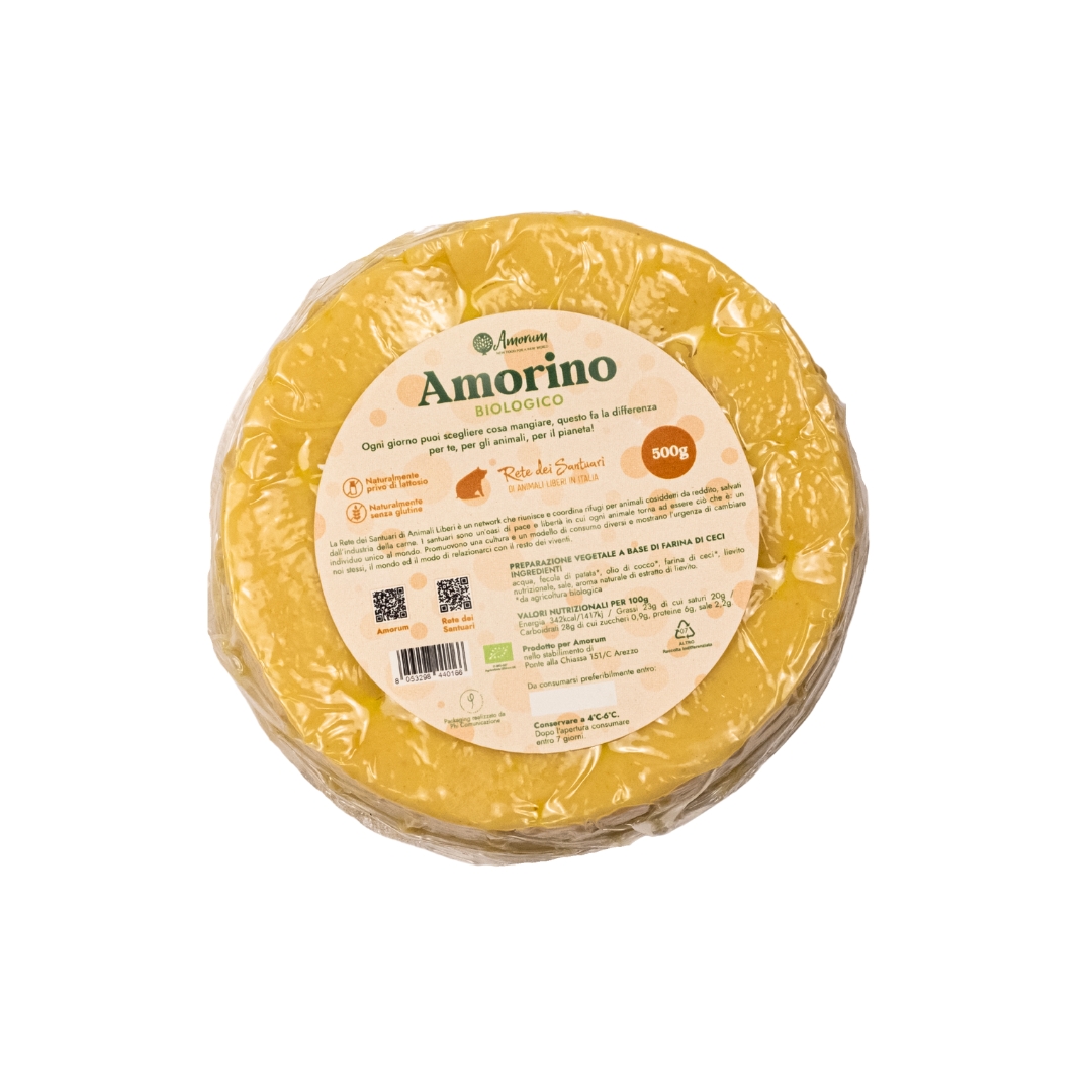L’Amorino Biologico è un’alternativa vegetale a base di farina di ceci. Nata in collaborazione con la Rete dei Santuari, grazie all’Amorino porterai in tavola non solo l’eccellenza di un formaggio vegetale prodotto in Italia, ma anche la storia di un rifugio e di un animale che è stato salvato e che ora vive libero e felice.