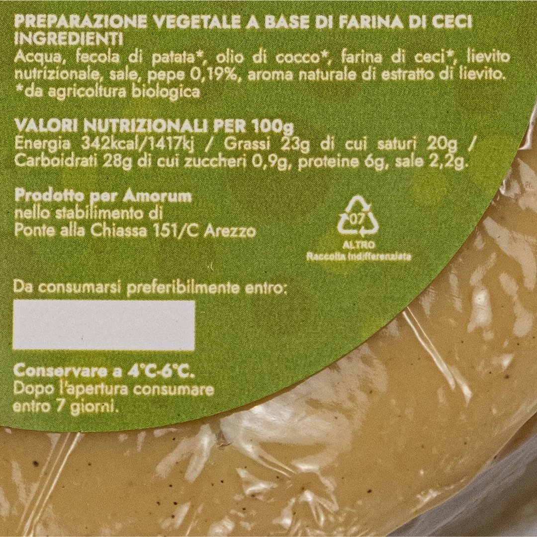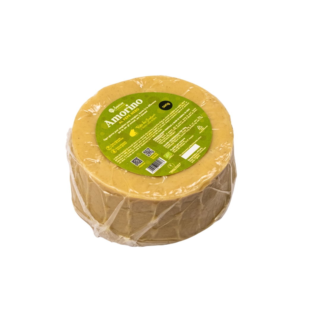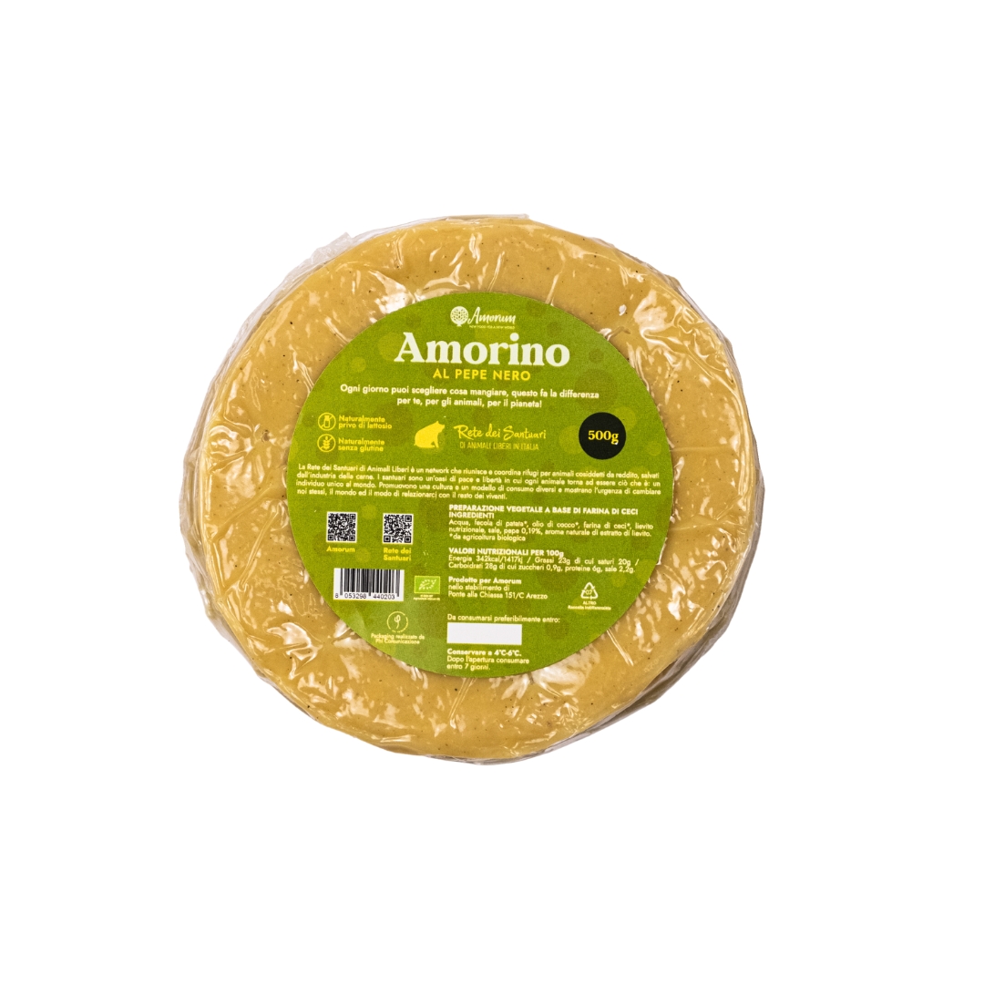 L’Amorino al pepe nero è un’alternativa vegetale a base di farina di ceci. Nata in collaborazione con la Rete dei Santuari, grazie all’Amorino porterai in tavola non solo l’eccellenza di un formaggio vegetale prodotto in Italia, ma anche la storia di un rifugio e di un animale che è stato salvato e che ora vive libero e felice.