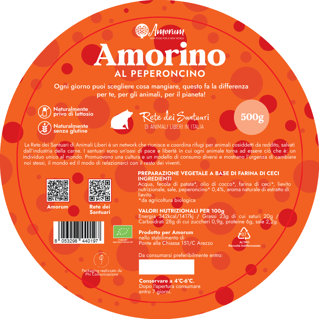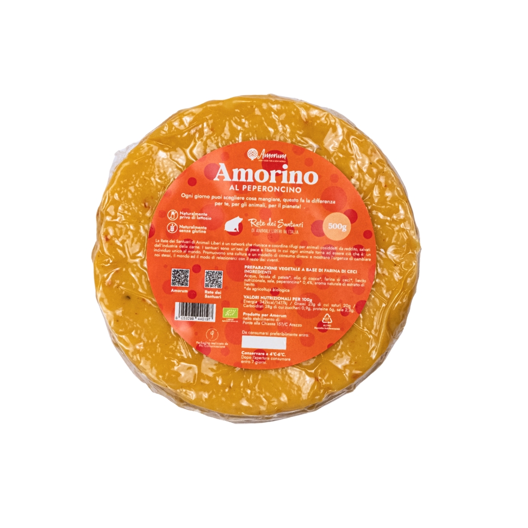 L’Amorino al peperoncino è un’alternativa vegetale a base di farina di ceci. Nata in collaborazione con la Rete dei Santuari, grazie all’Amorino porterai in tavola non solo l’eccellenza di un formaggio vegetale prodotto in Italia, ma anche la storia di un rifugio e di un animale che è stato salvato e che ora vive libero e felice.