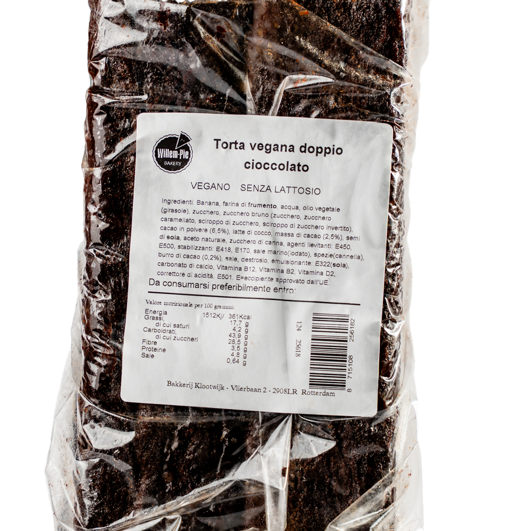 Banana, farina di frumento, acqua, olio vegetale (girasole), zucchero, zucchero bruno (zucchero, zucchero caramellato, sciroppo di zucchero, sciroppo di zucchero invertito), cacao in polvere (6,5%), latte di cocco, massa di cacao (2,5%), semi di soia, aceto naturale, zucchero di canna, agenti lievitanti: E450, E500, stabilizzanti: E418, E170, sale marino(iodato), spezie(cannella), burro di cacao (0,2%), sale, destrosio, emulsionante: E322(soia), carbonato di calcio, vitamina B12, Vitamine B2, Vitamine D2, correttore di acidità E501. Numeri E = Additivi approvati dall'UE.