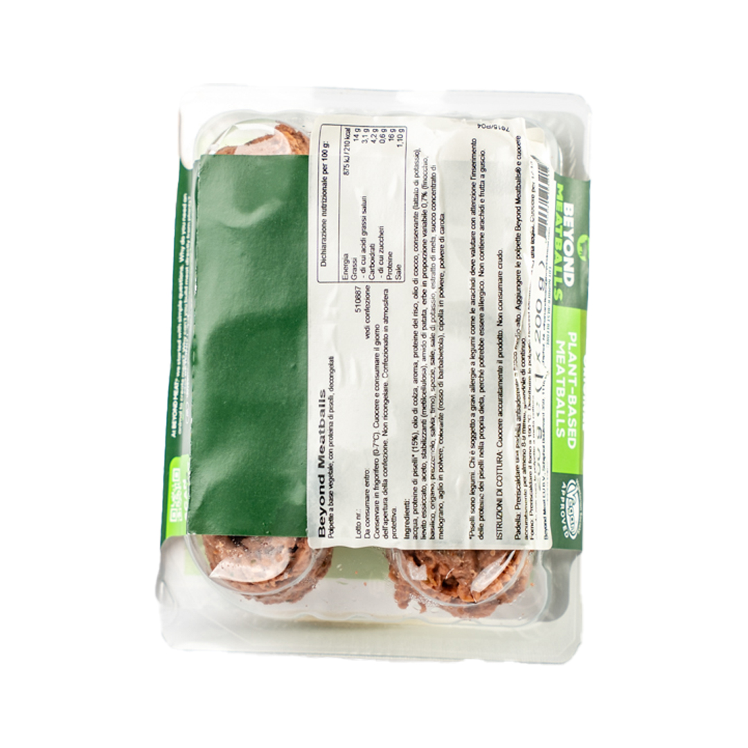 Acqua, proteine di piselli* (15%), olio di colza, aroma, proteine di riso, olio di cocco, conservante (lattato di potassio), lievito essiccato, aceto, stabilizzante (metilcellulosa), fecola di patate, erbe aromatiche in proporzione variabile 0,7% (finocchio, basilico, origano, prezzemolo, salvia e timo), spezie, sale, sale di potassio, estratto di mela, succo di melograno concentrato, aglio in polvere, colorante (rosso di barbabietola), cipolla in polvere, carota in polvere.