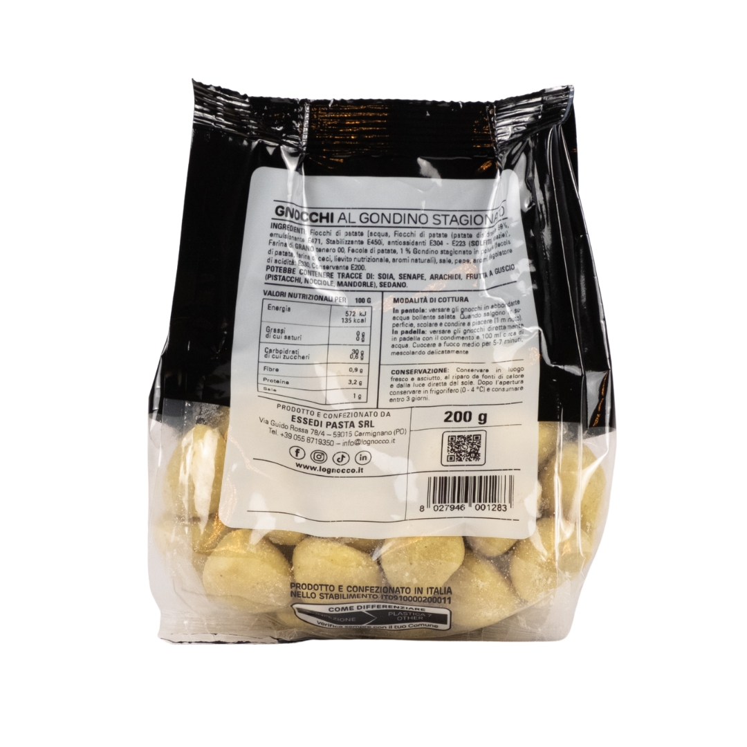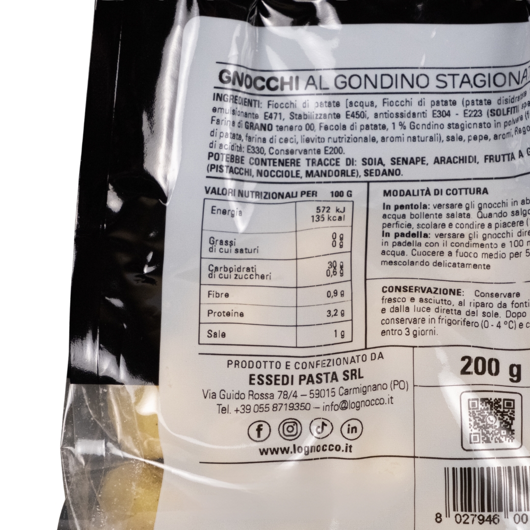 Fiocchi di patate [acqua, Fiocchi di patate (patate disidratate 99%, emulsionante E471, Stabilizzante E450i, antiossidanti E304-E223 (SOLFITI),spezie)], Farina di GRANO tenero 00, Fecola di patate, 1 % Gondino stagionato in polvere(fecola di patata, farina di ceci, lievito nutrizionale, aromi naturali), sale, pepe, aromi, Regolatore di acidità: E330, Conservante E200.
