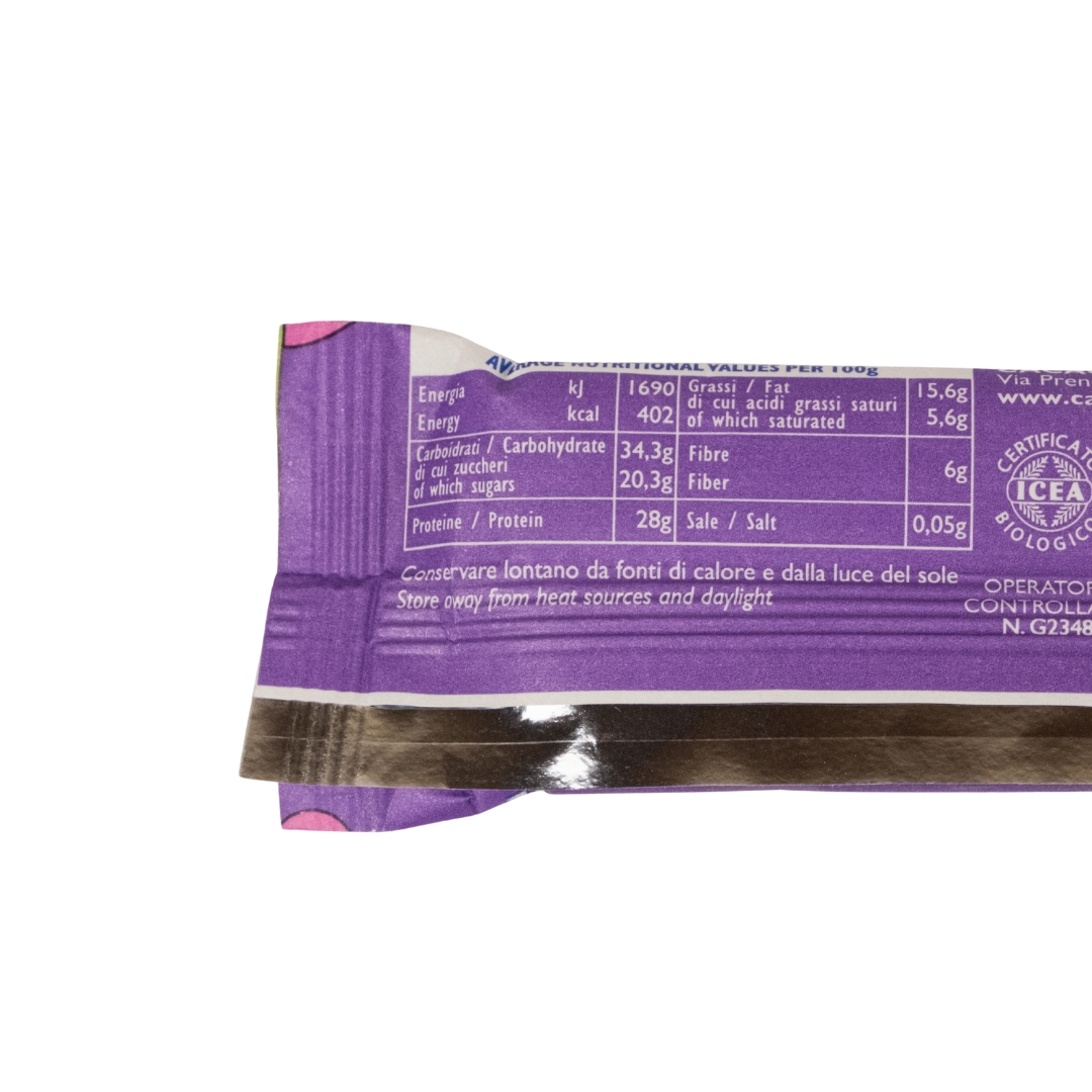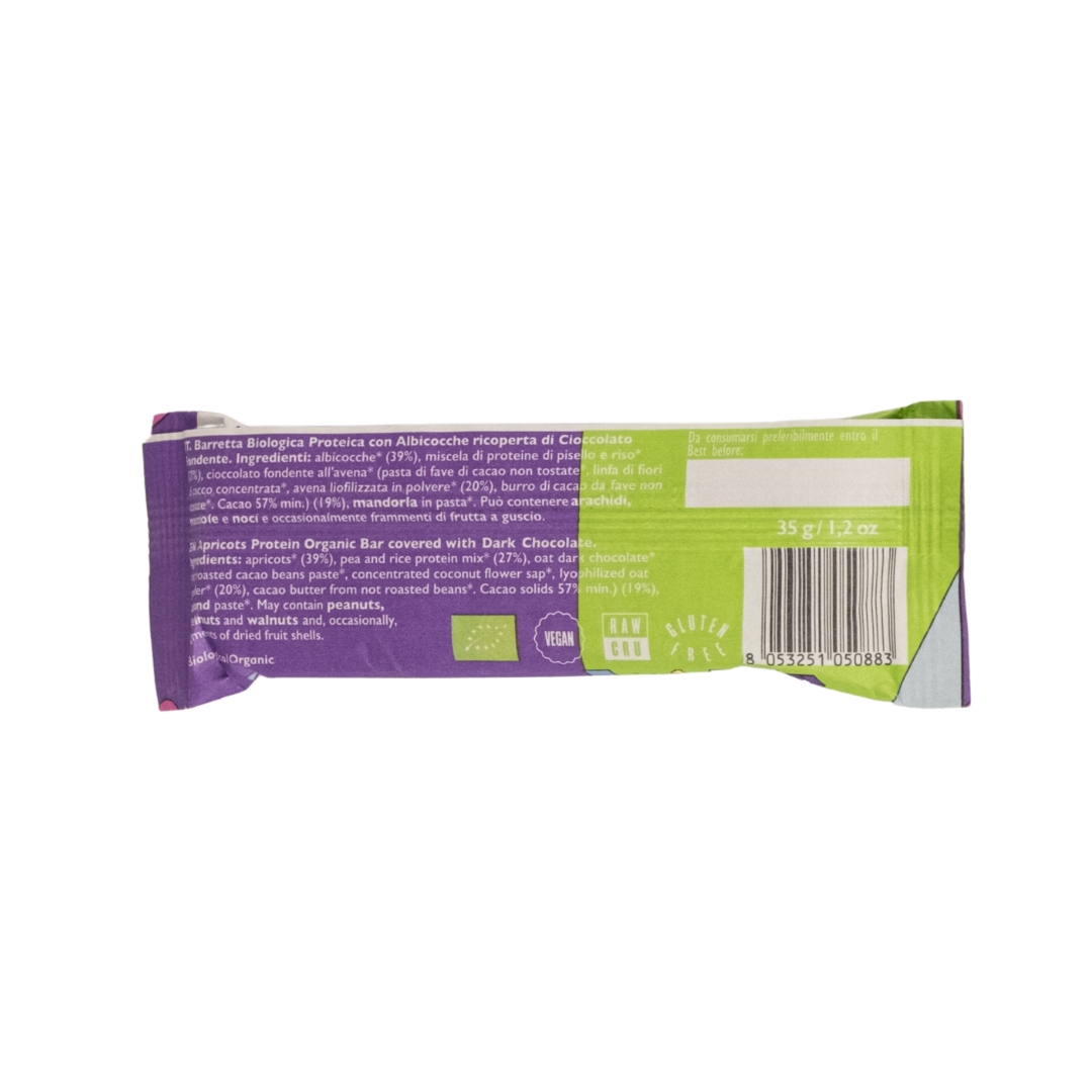 Albicocche*(39%), miscela di proteine di pisello e riso*(27%), cioccolato fondente all'avena*(pasta di fave di cacao non tostate*, linfa di fiori di cocco concentrata*, avena liofilizzata in polvere*(20%), burro di cacao da fave non tostate*. Cacao 57% min.) (19%), mandorla in pasta*.
